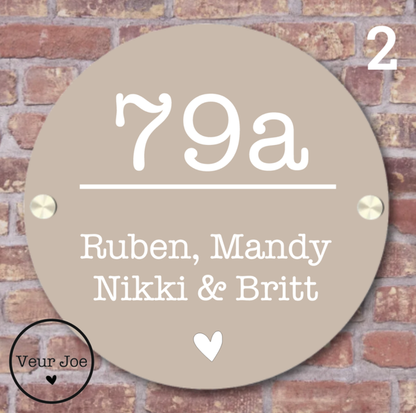 Een mooi rond naambordje voor bij de voordeur, gemaakt van Dibond (wat een matte finish heeft en luxe oogt).